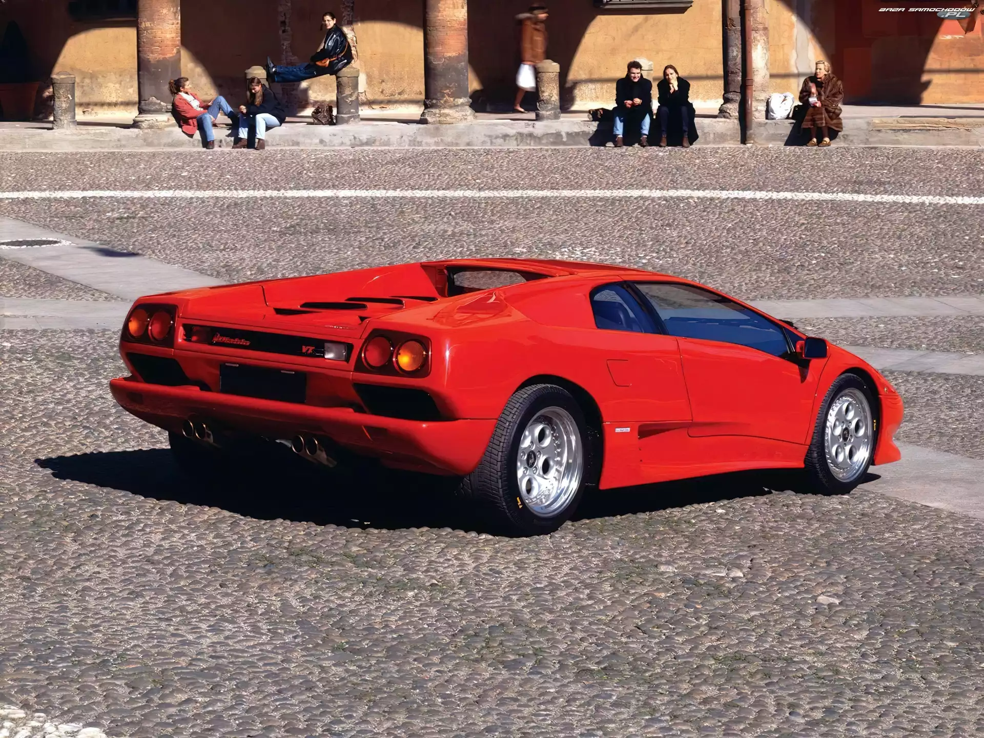 , Srebrne Lamborghini Diablo VT 6.0 SE, 2001 Czerwone, Lamborghini Diablo Lamborghini Diablo, Plac, Brukowa, Kostka